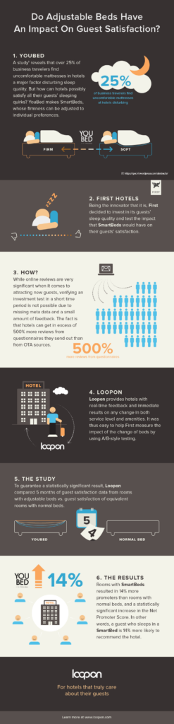 Some hotels have already addressed this problem by introducing adjustable beds, an example of this being First Hotels. In order to see if the change had an impact on First’s guest satisfaction, Loopon gave them a hand. Take a look at the infographic below and the following interviews to get the whole story!