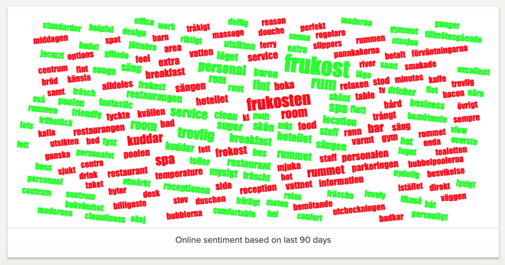 Sometimes it’s useful to complete more semantic analyses of the feedback texts from the guests, to identify patterns that don’t always show up in numbers and diagrams. A couple of years ago we did such an analysis where we looked at which adjectives were mostly used to describe different parts of the guest experience at the hotel. Here we were able to identify a new and interesting pattern. Location was perfect, the service was excellent but breakfast was just “good”. The breakfast definitely stood out. There were rarely complaints about the breakfast but it wasn’t often praised with superlatives like the personnel or location was.